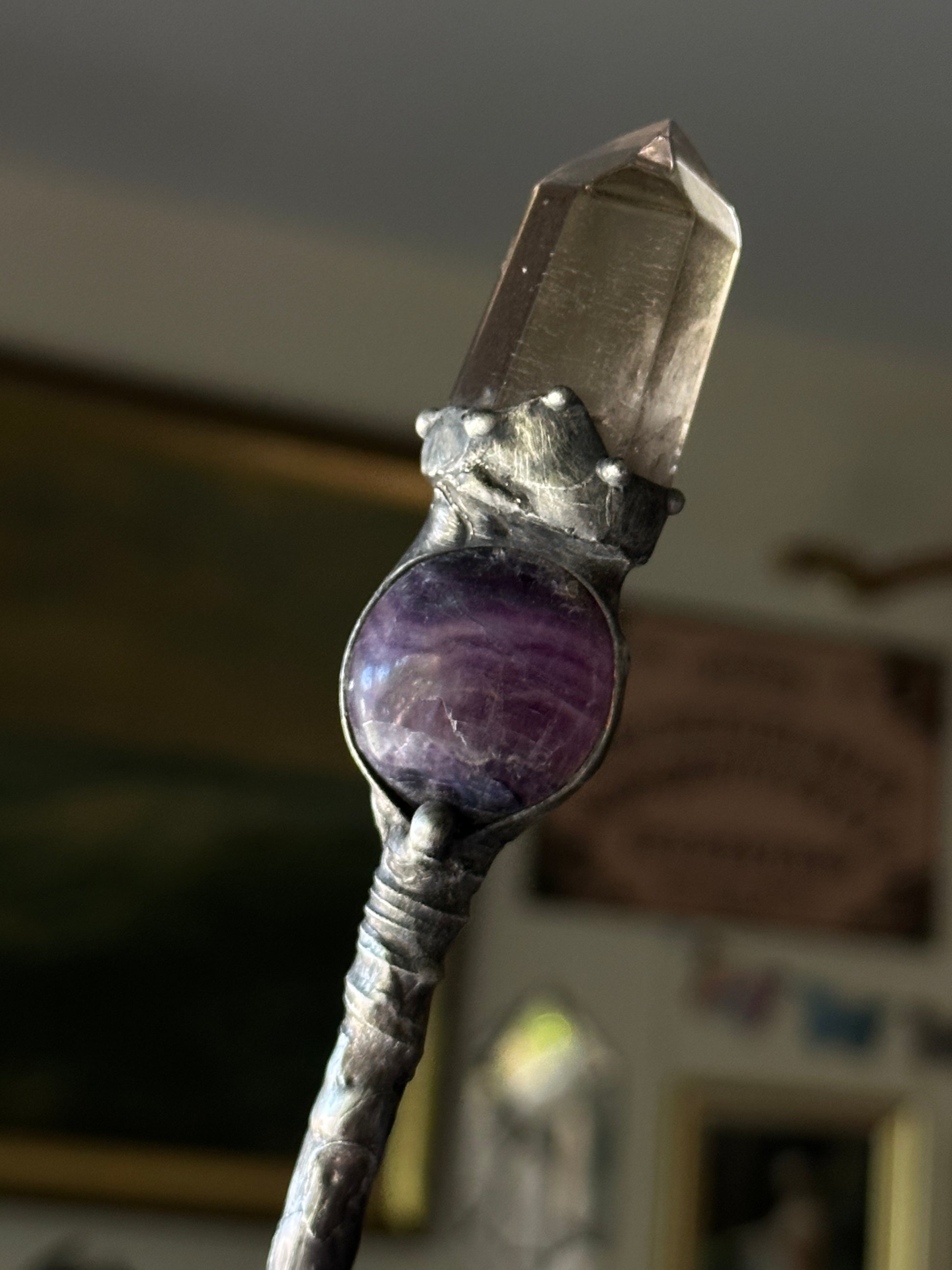 Anchored by a luminous quartz point at the crown, it channels clarity, light and focus. prefect for ritual work and energy redirection. beneath sits a polished orb of amethyst, a stone revered for its protective and intuitive properties.