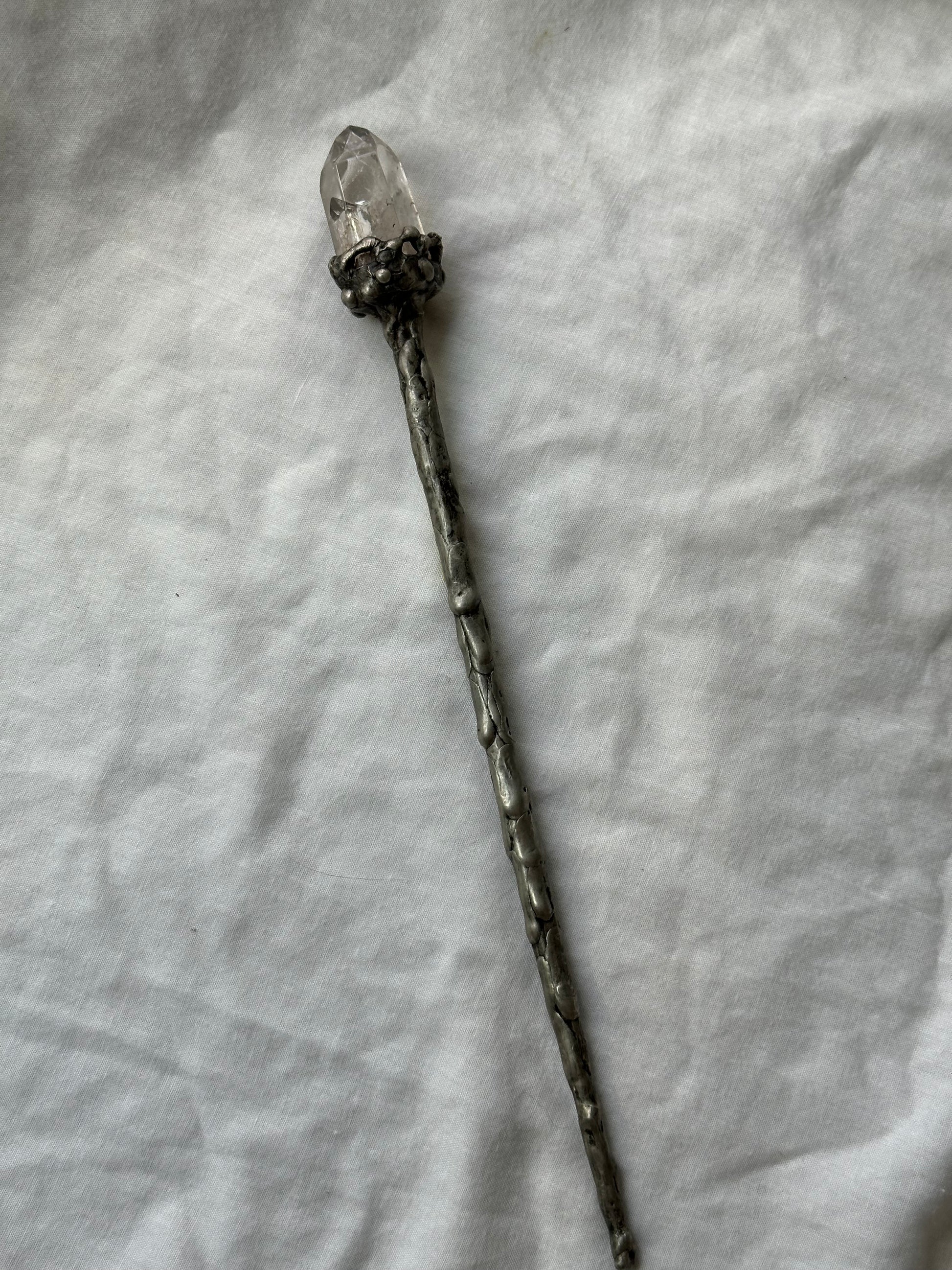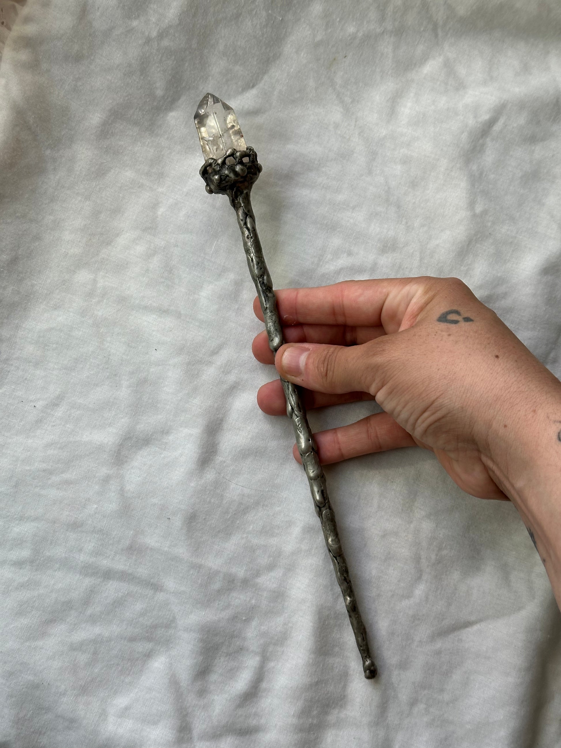 This clear quartz crystal, is wrapped in metal as if crowing the wand in a shard of light. Forged our of a silver metal alloy, and darkened with a black patina for an aged look.