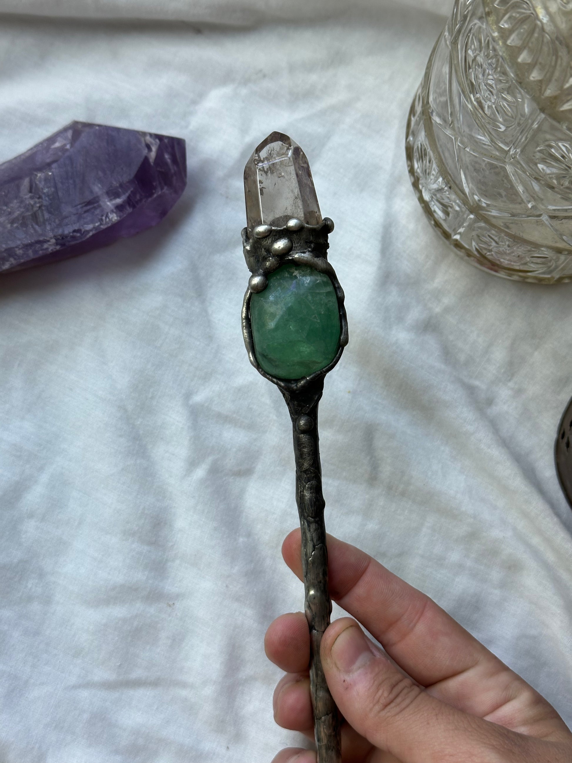 A beautiful clear quartz crystal sits atop a green fluorite stone. The wand is forged in a silver bearing alloy, and darkened with a black patina.