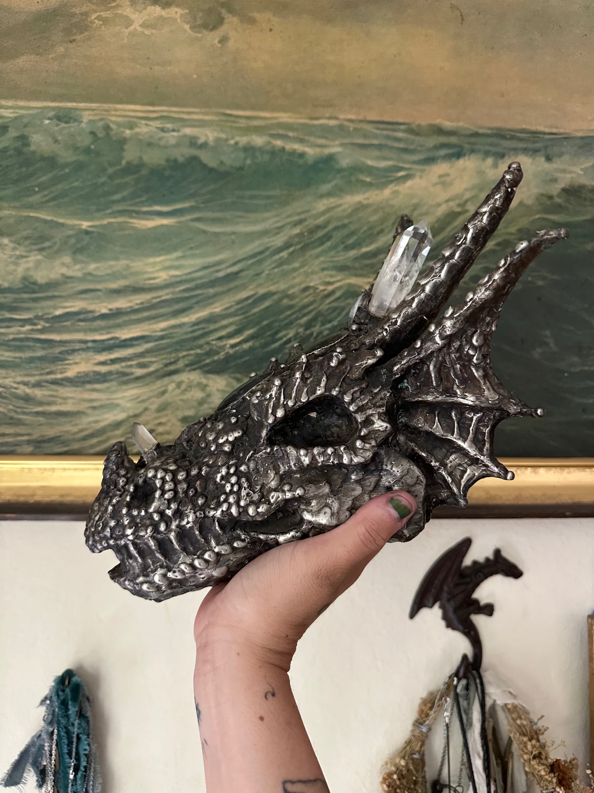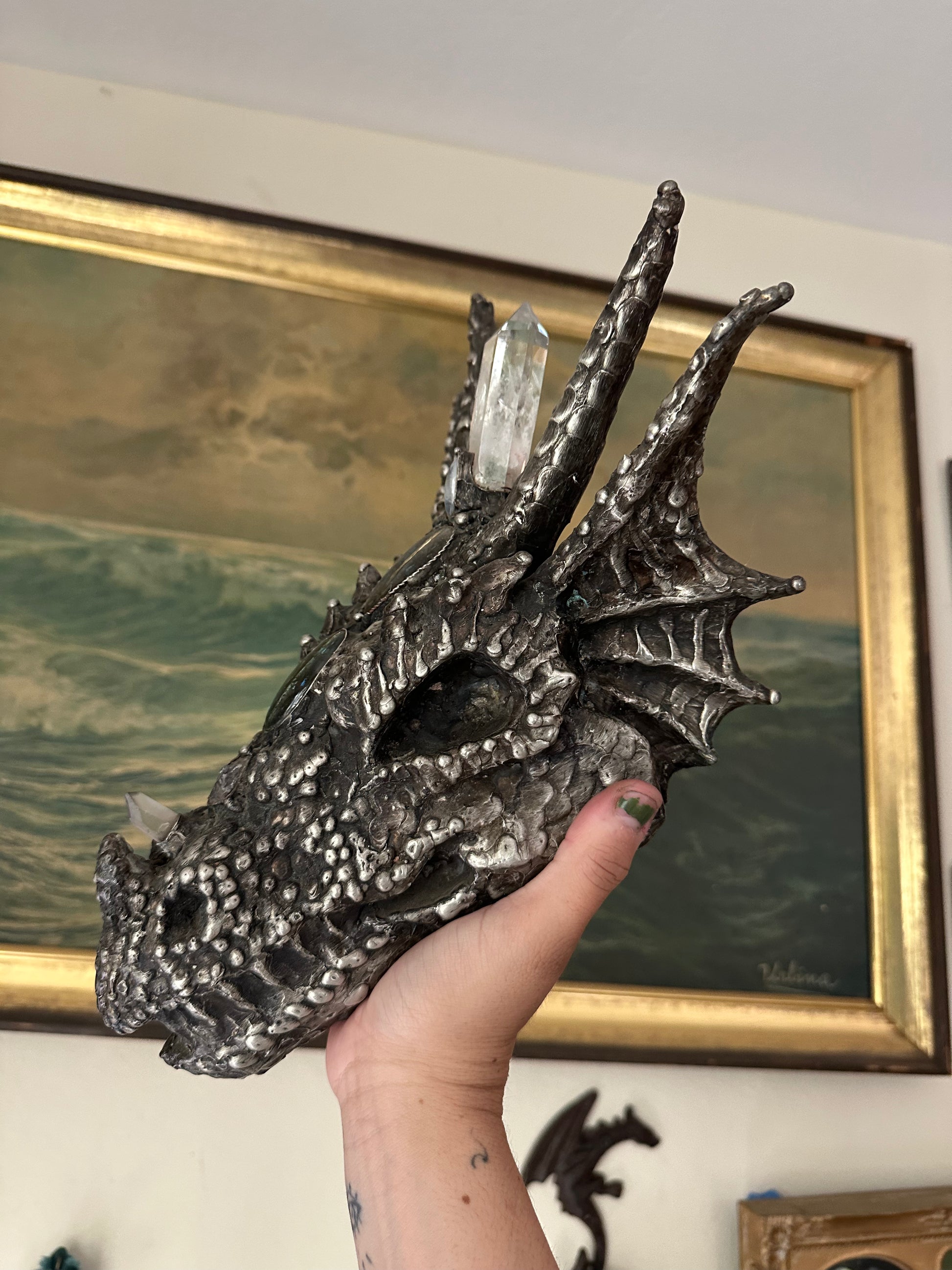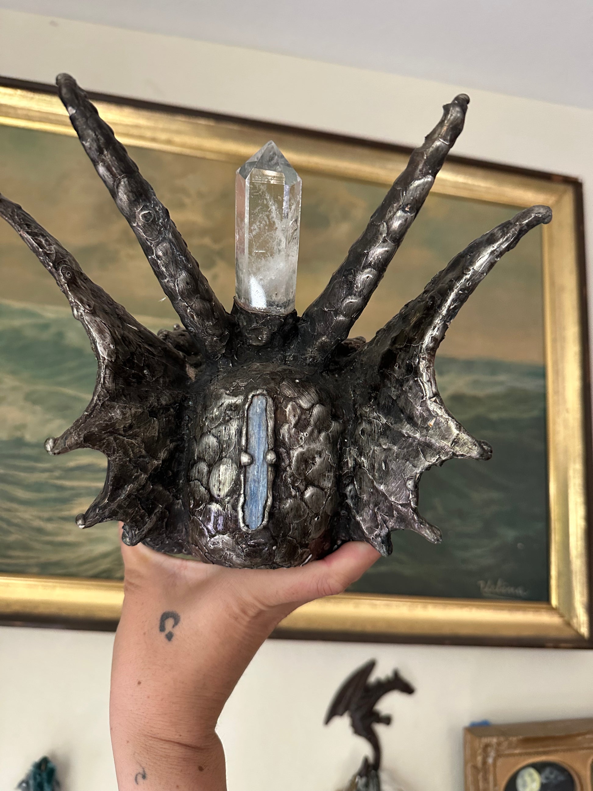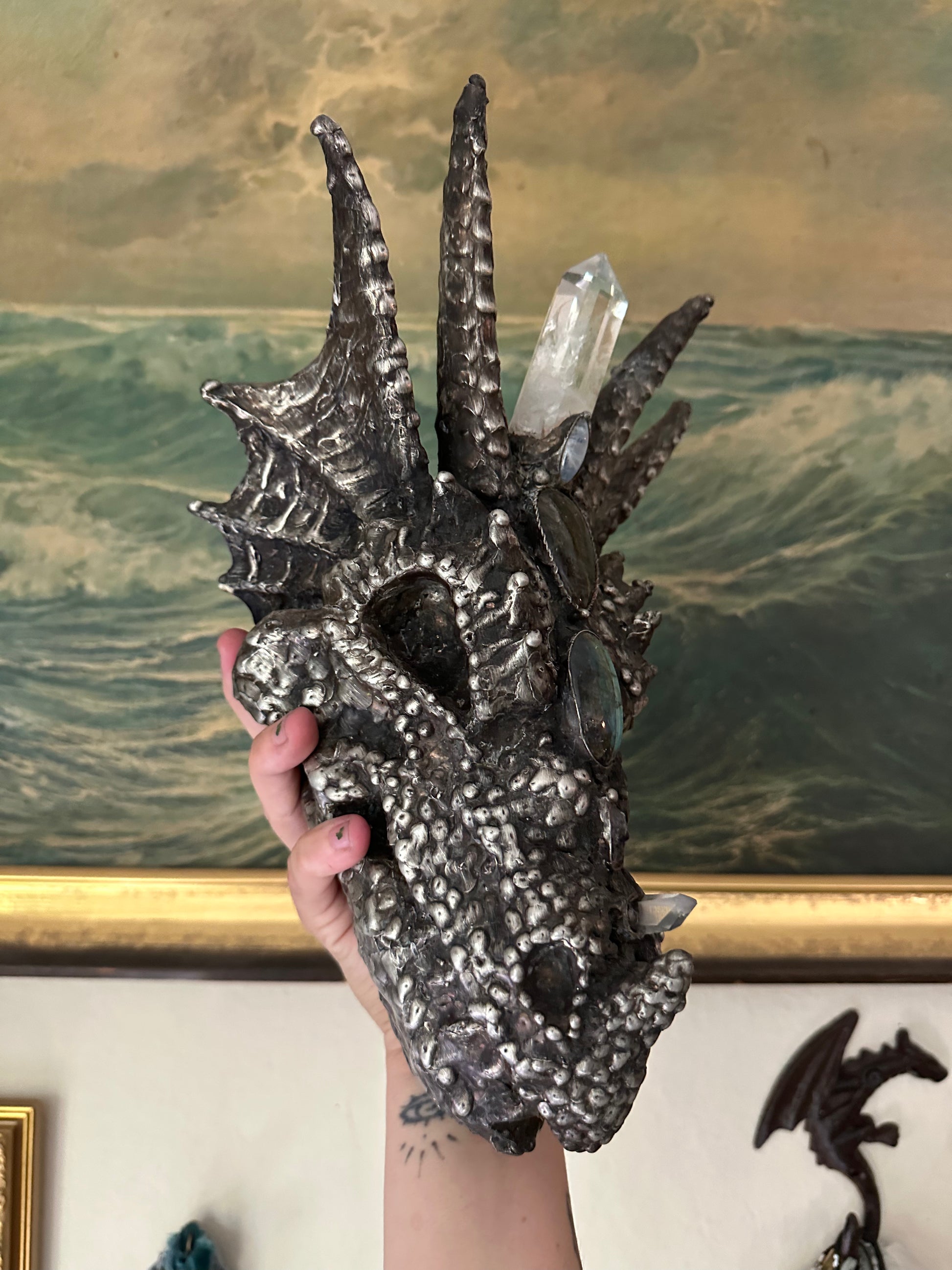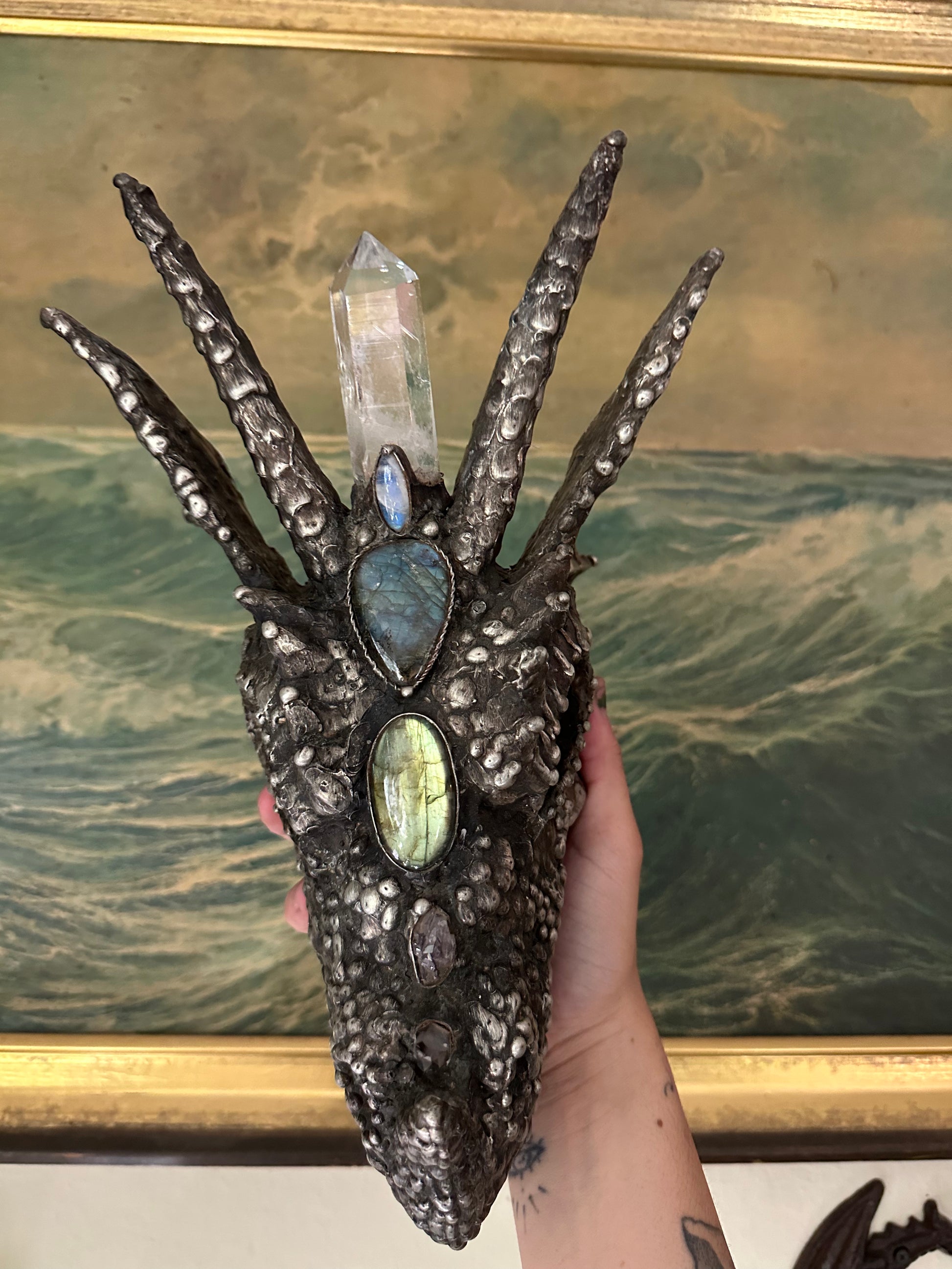 A powerful piece for the alter, A dragon skull of metal, adorned in a big clear quartz pillar, a blue labradorite and green labradorite with an amethyst at the nose, and clear quartz horn at its tip. A blue kyanite sits at the base of the skull, an activator of speech, clarity, and awakens the throat chakra.