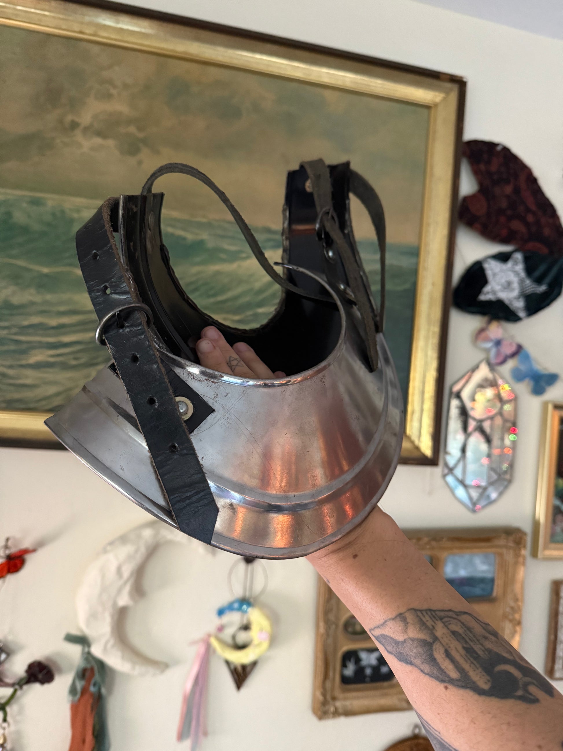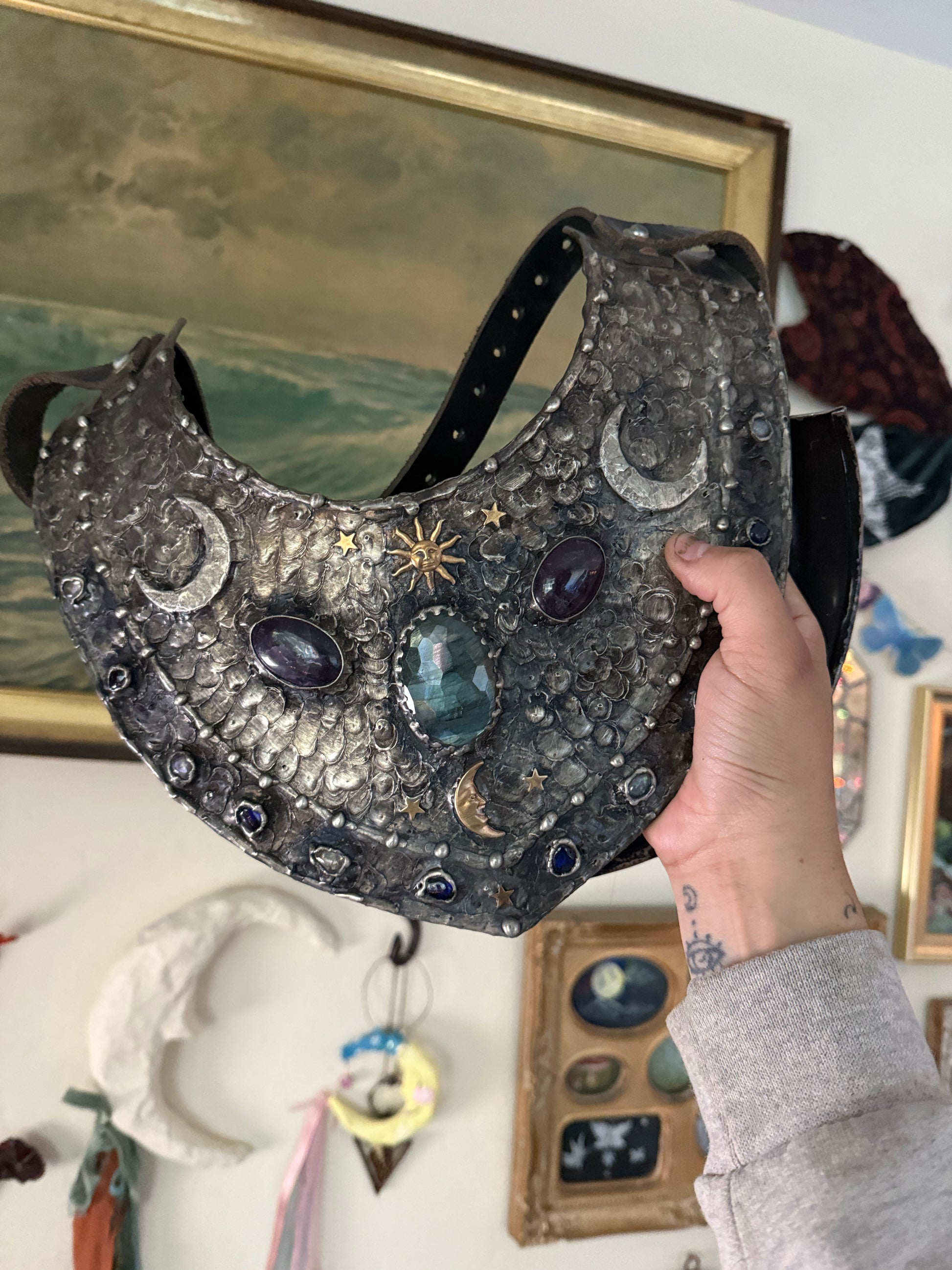 This is an up cycled chest plate, that I found second hand and covered it in metal workings and crystals. labradorite and amethyst cabochons, are surrounded by celestial bodies, dyed blue stones frame the piece.