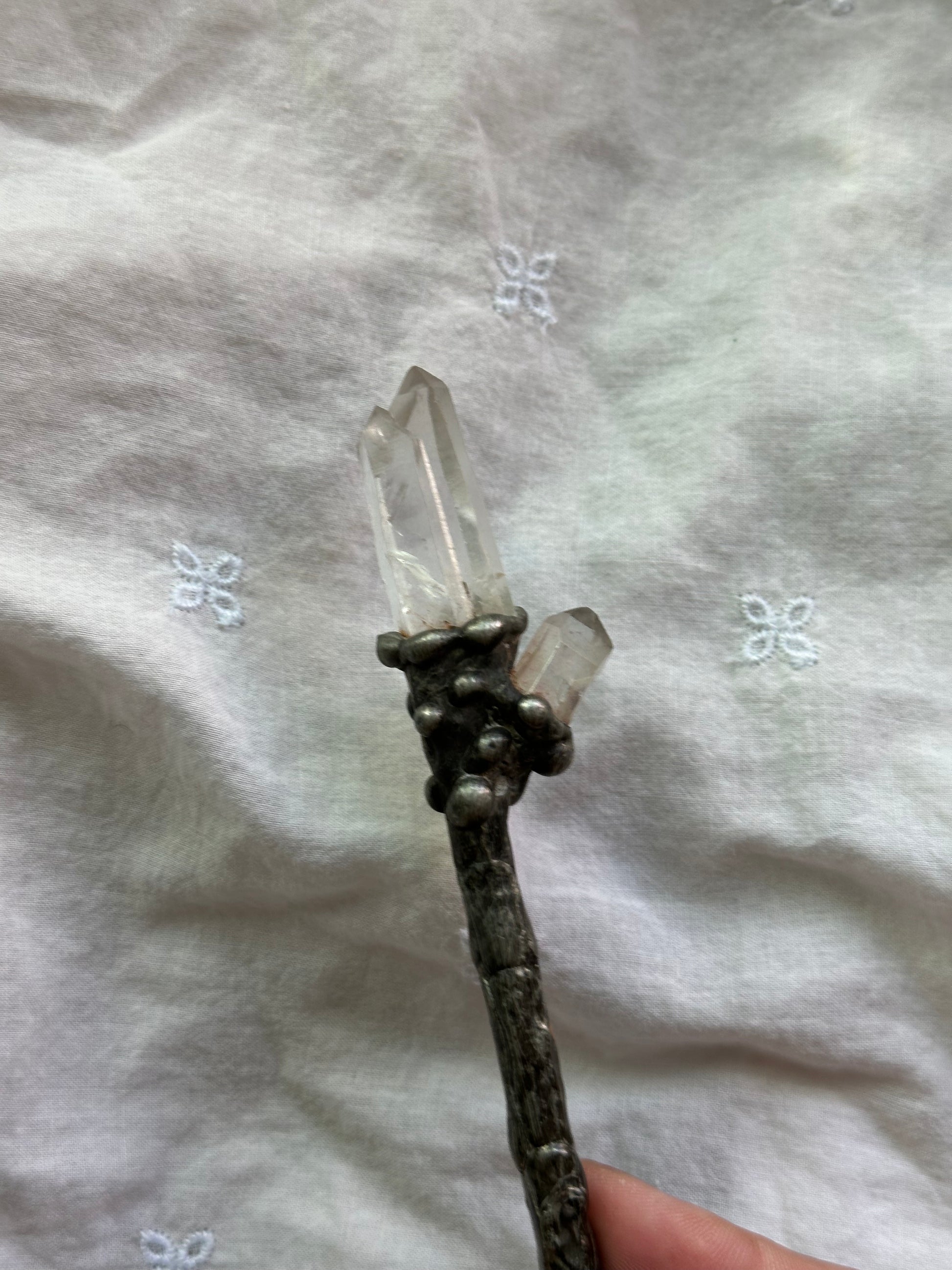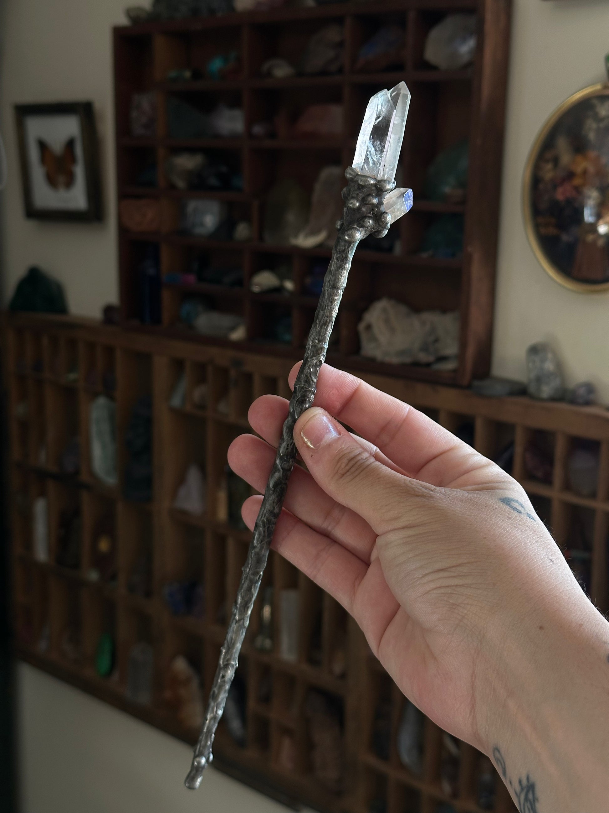 A clear quartz and tiny aura quartz shard crown this wand from my full moon wand series. Like a beam of light shining down upon you from the moon, this wand illuminates all the spaces that have been in hiding. All the places you've tucked away, your deepest yearning, are now out in the open, waiting to be tended to in gentleness and love. How will you wield your power?