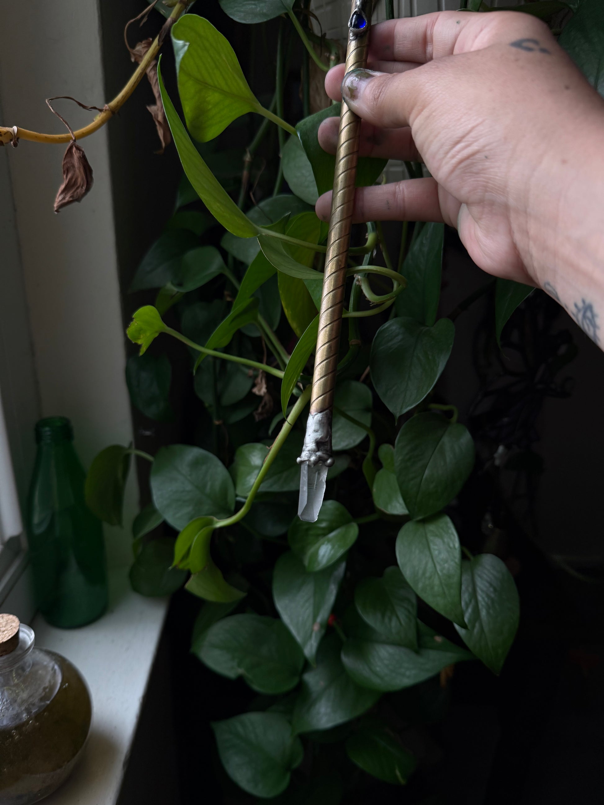 A smokey quarts sits at the top of this wand, beneath is a tiny blue glass stone. The bottom of the wand, is pointed with a quartz shard. This wand is one to reveal, to protect, to reveal.