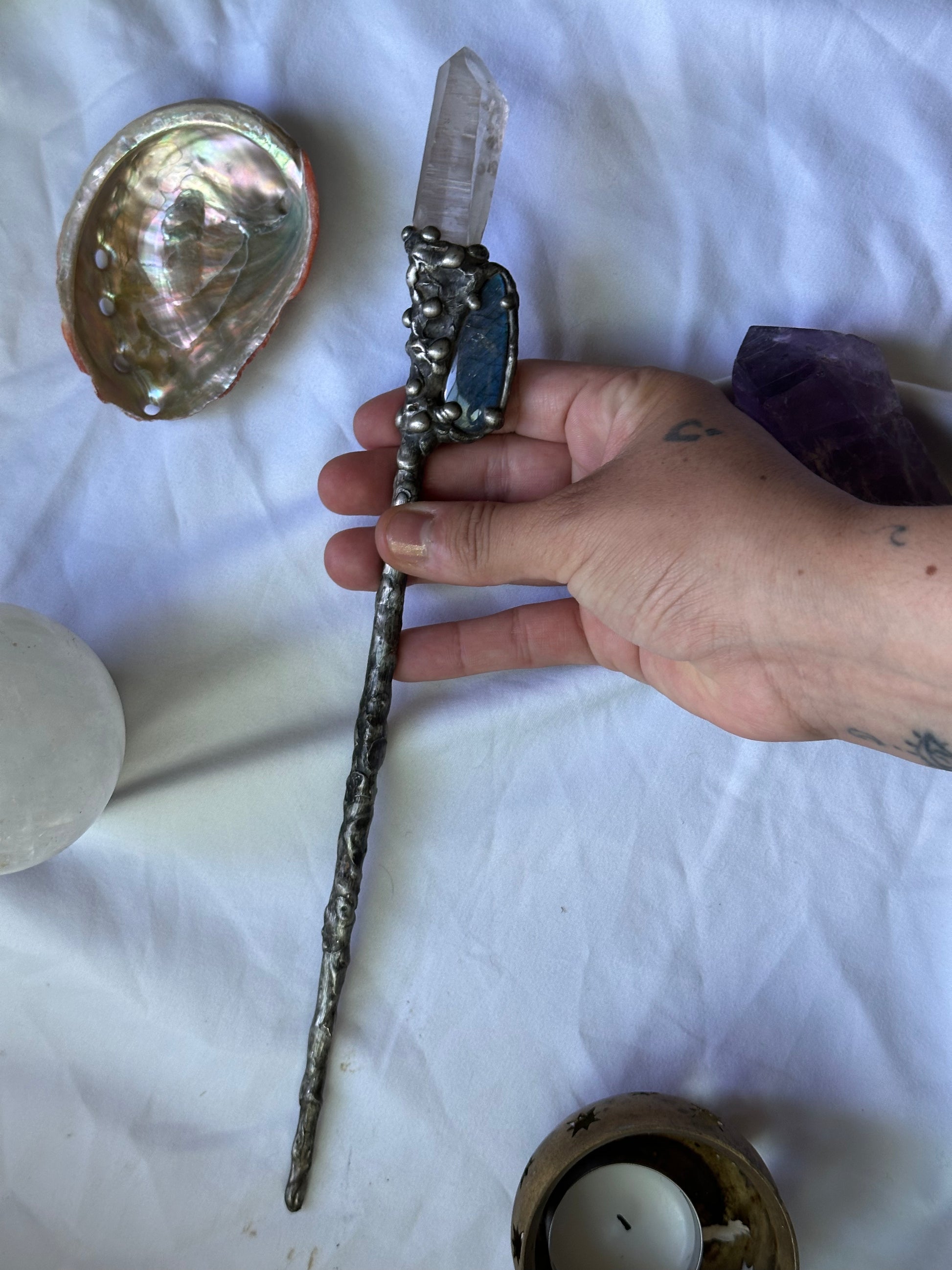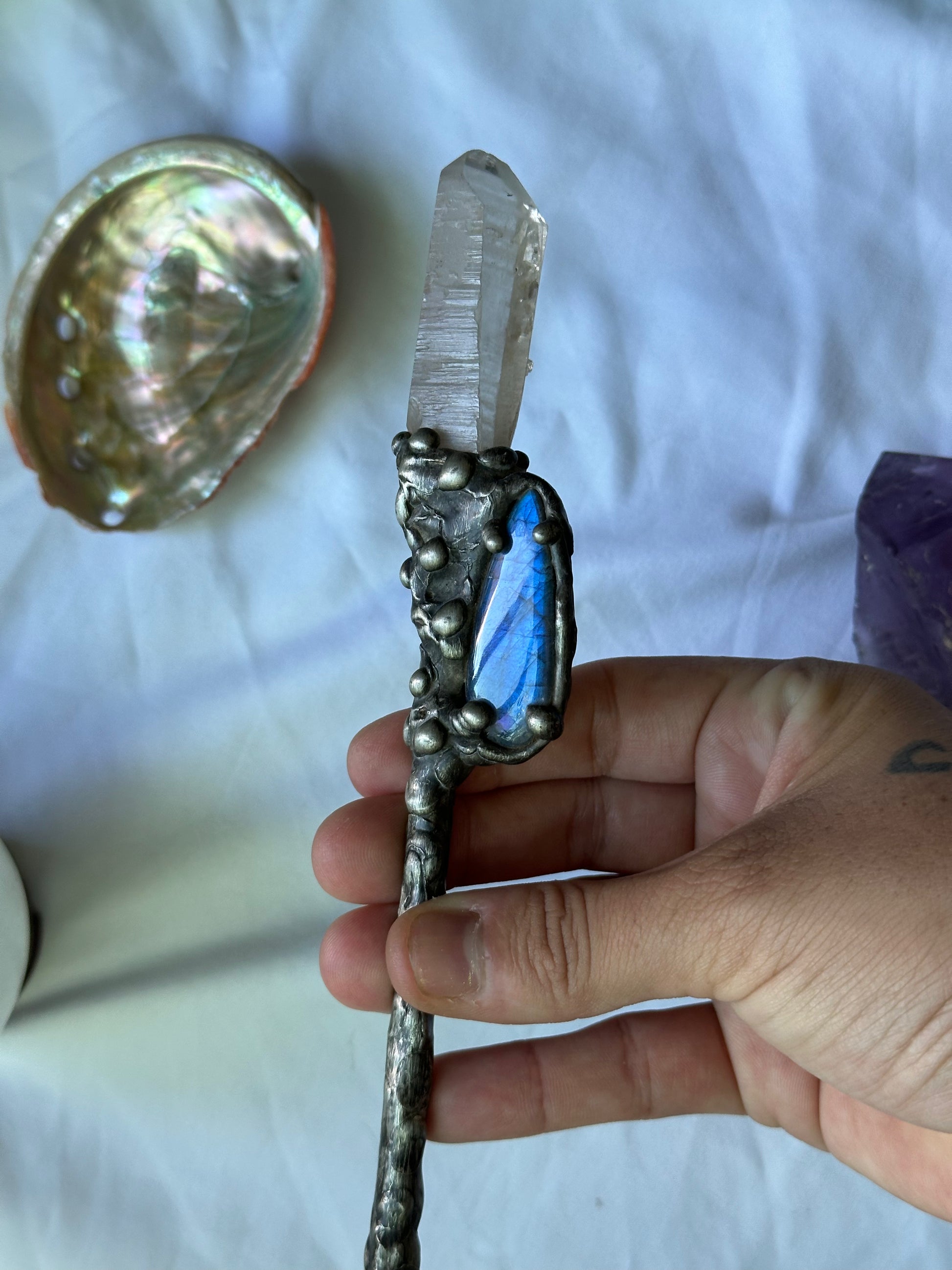 As if pulled from the tides from a sirens lair, this quartz and labradorite pairing are sure to help to summon the magic you seek.