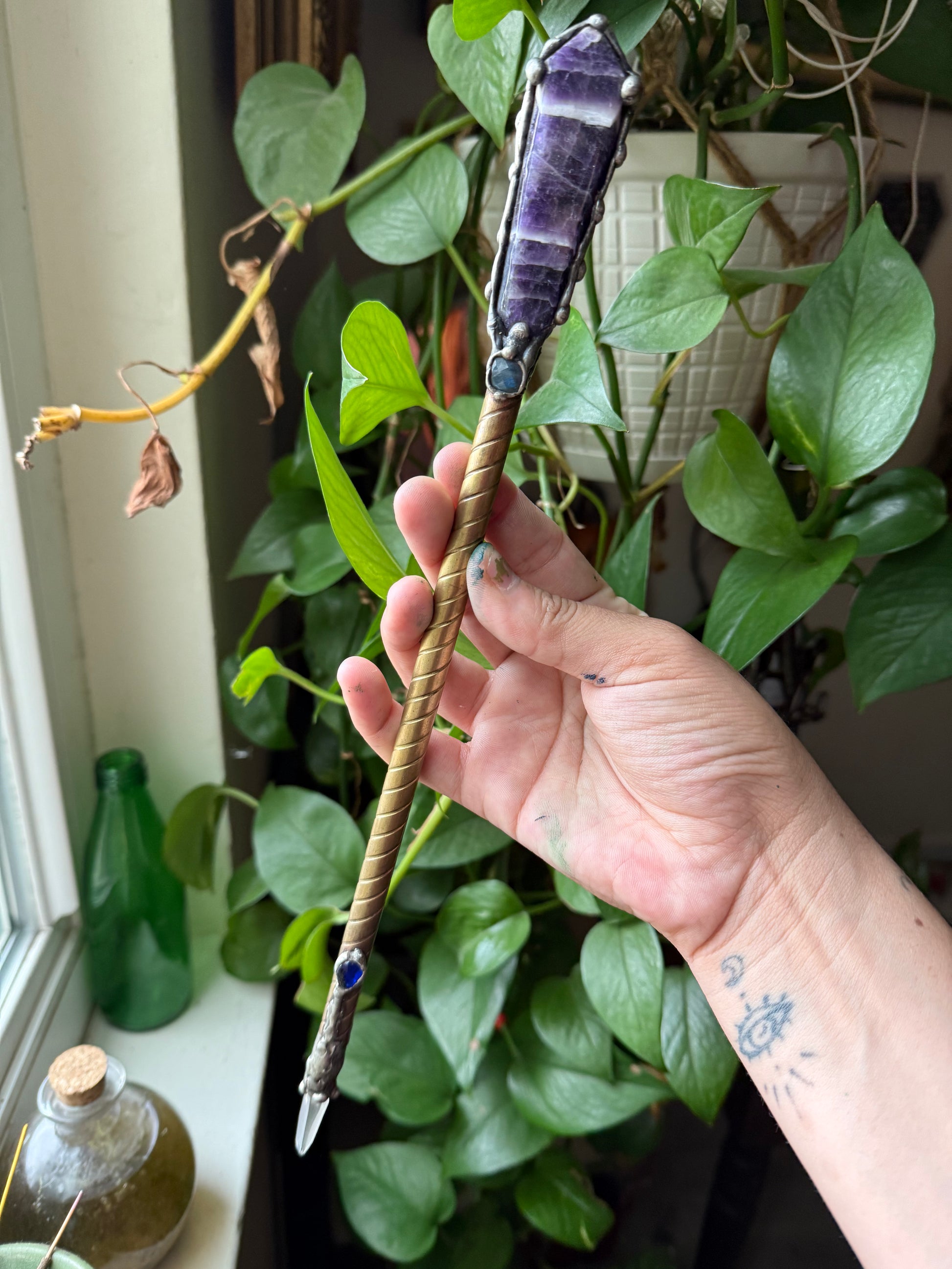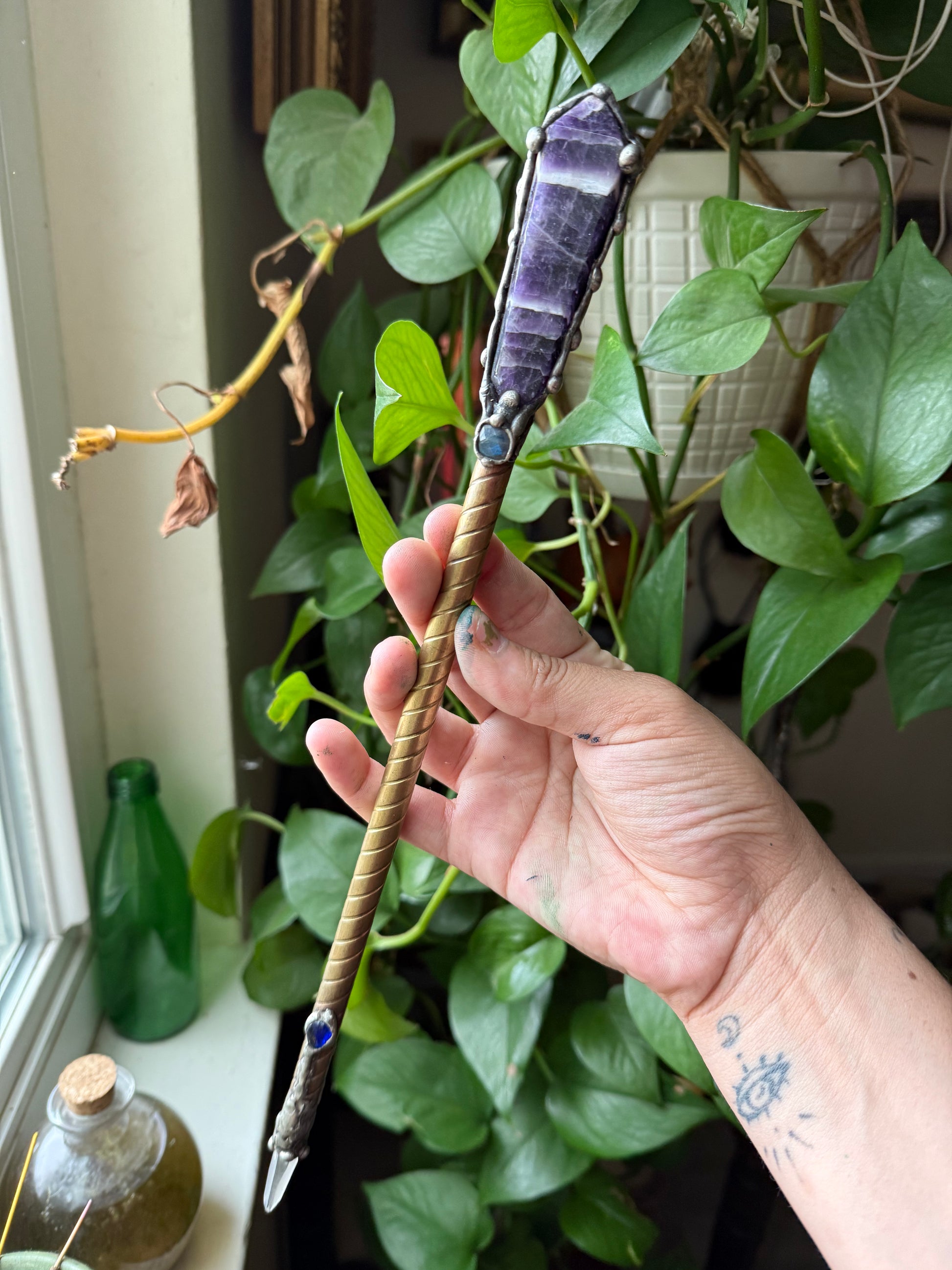 A beautiful double terminated chevron amethyst known for aiding in divine connection, psychic protection and higher alignment, paired with a rose cut labradorite stone sitting beneath it. The bottom point of the wand is a clear quartz and on the shaft, a blue glass stone.