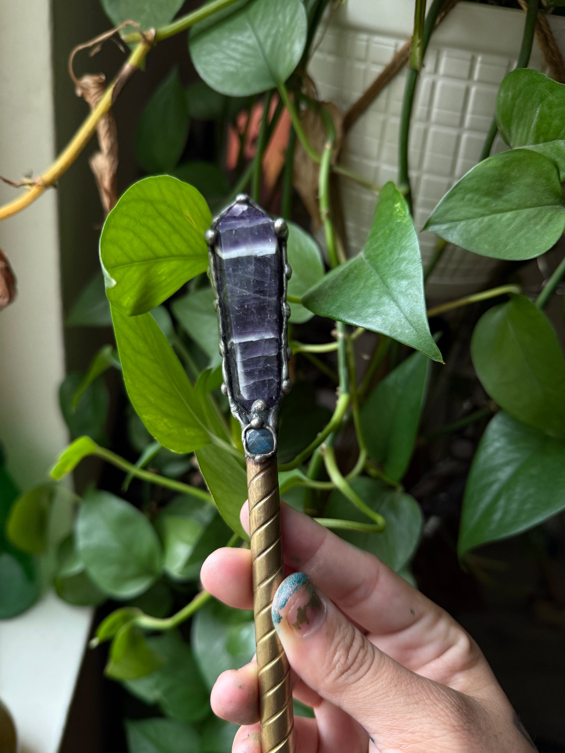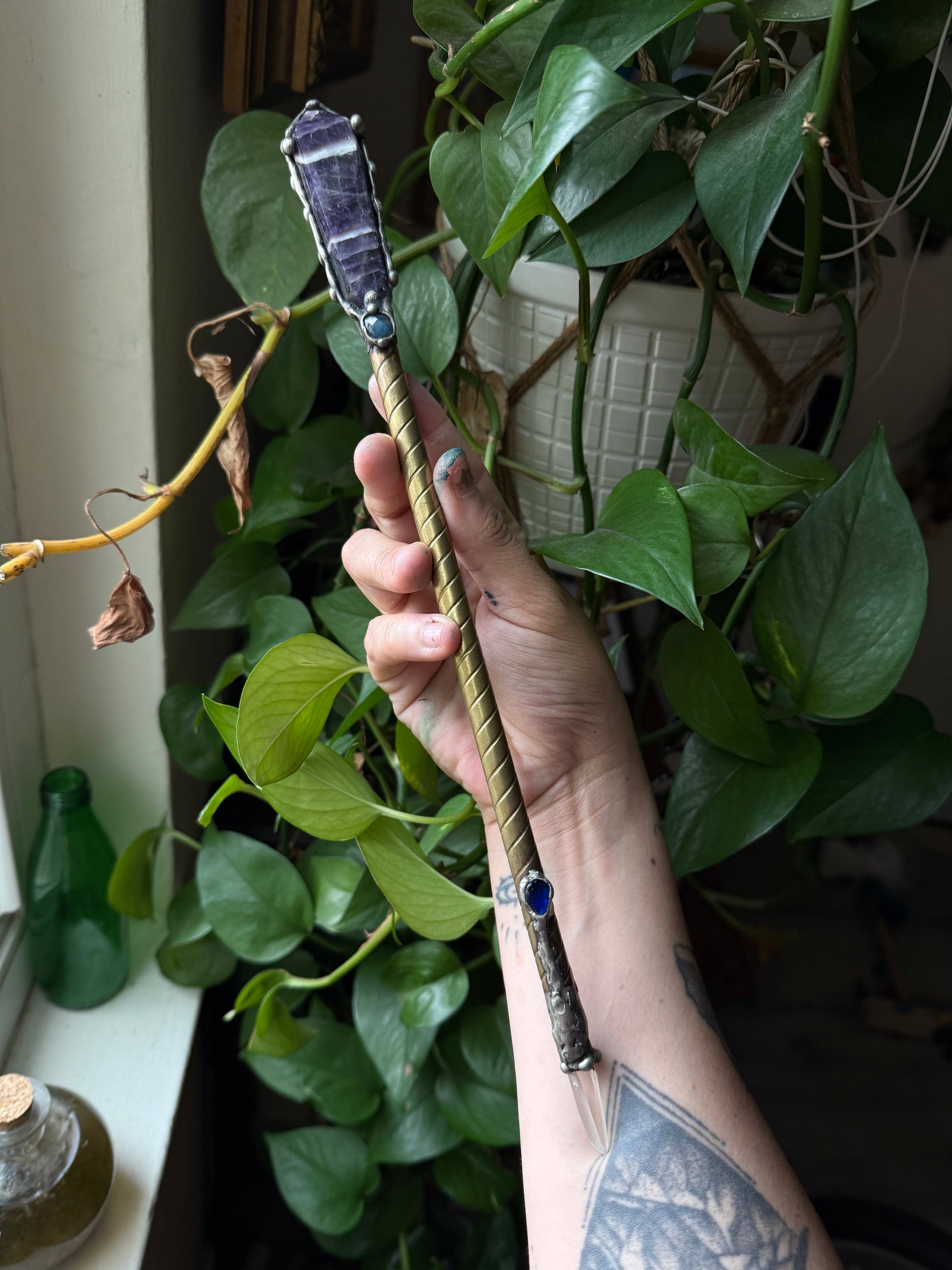 hand crafted wand, wound in spiraling brass, and silver mixed metal alloy.
