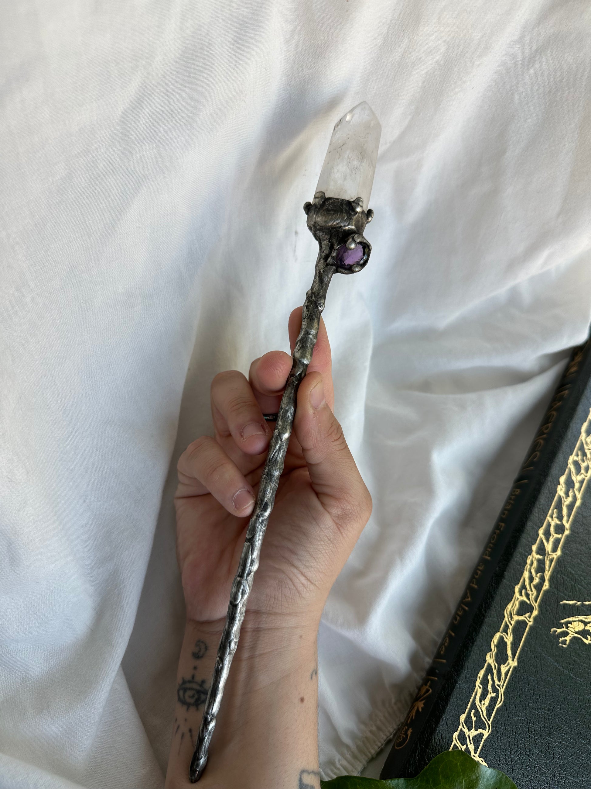 This wand is a clear quartz, paired with a hand cut faceted amethyst, like a peering eye. Amethyst is known for healing, mental clarity and clearing emotional blockages, paired with the quartz master healer, this wand can truly help amplify your spell workings and energy works surrounding transformation and manifestation, and beyond.