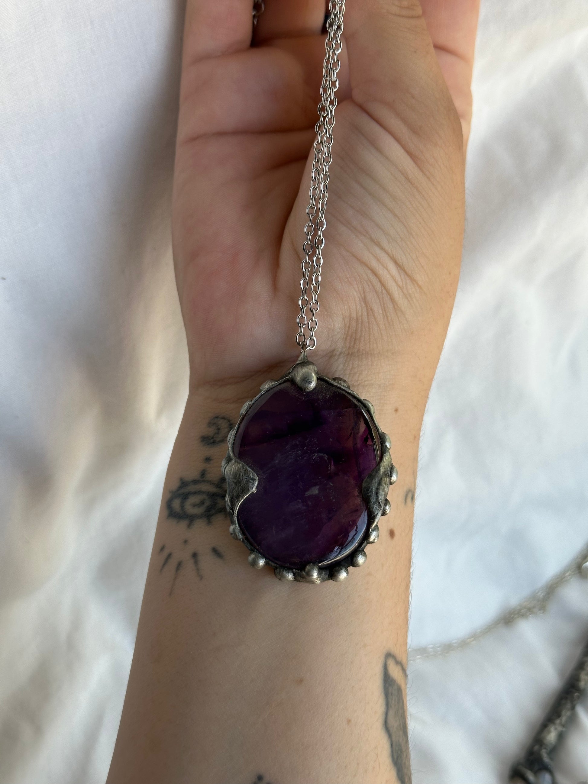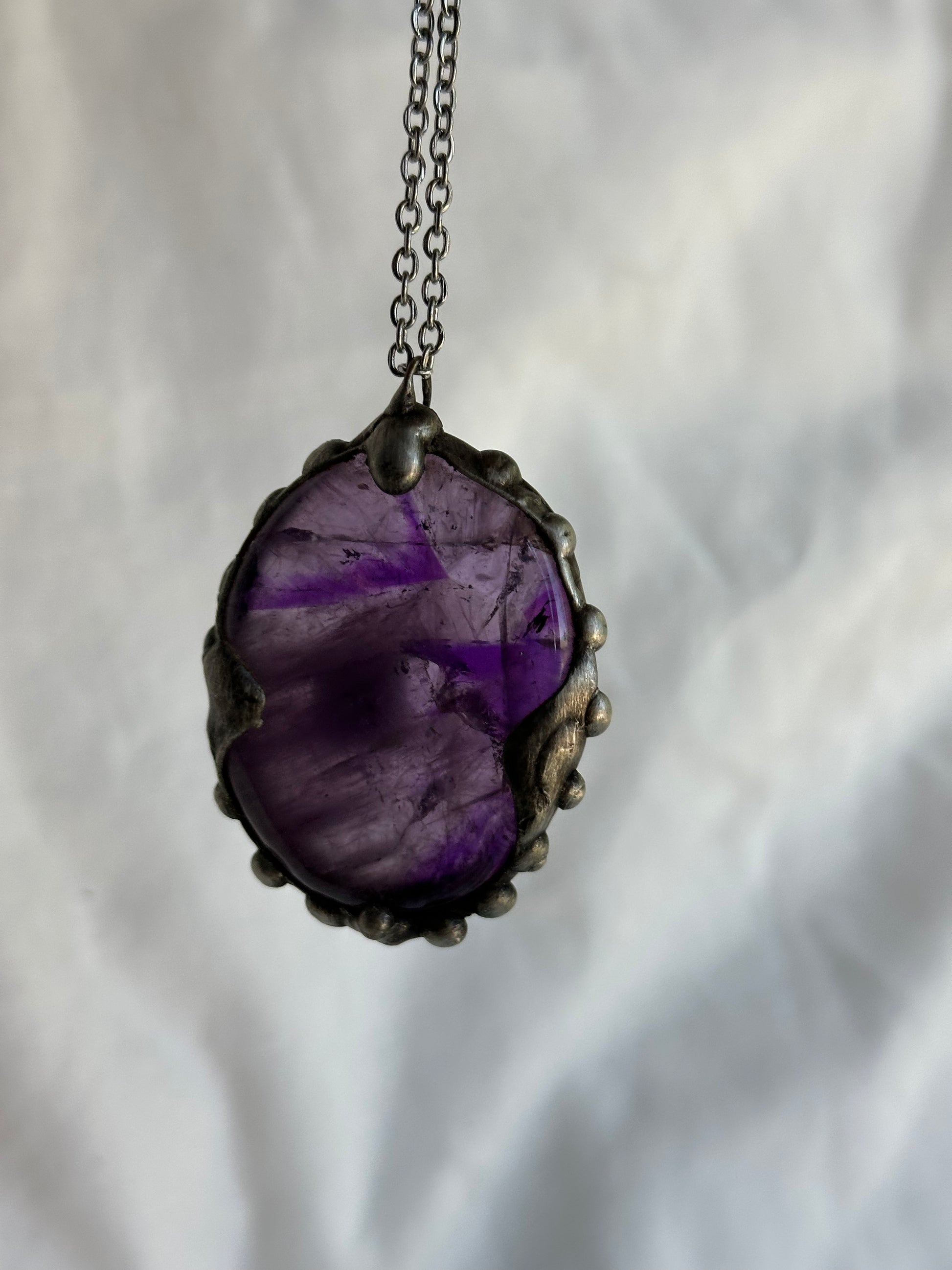 This amethyst is encased in a silver alloy, and hung on a stainless steel chain.