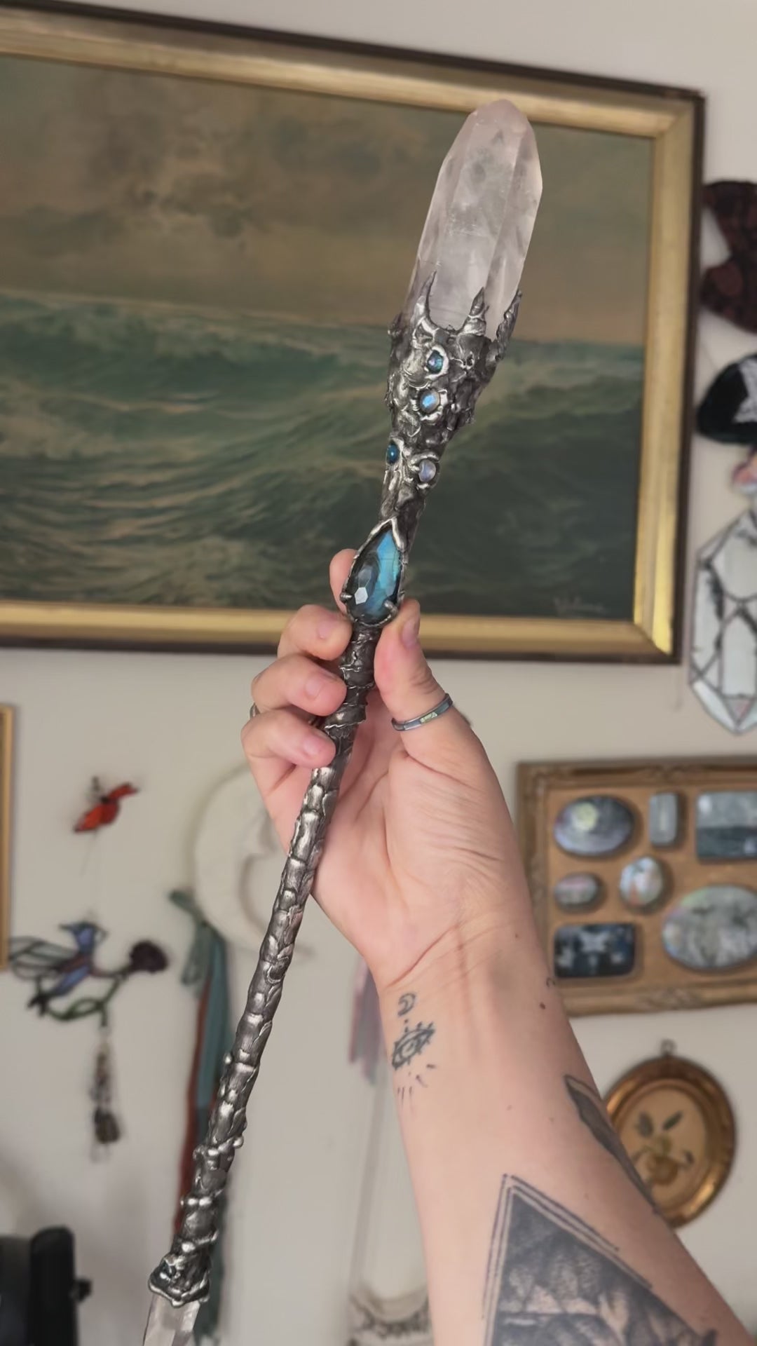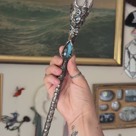 A big clear quartz sits at the crown of the wand, paired with a rose cut labradorite that glimmers like the waters beneath the moon. A small quartz is at the bottom. Twisting metal trails up the handle, a spiraling whirl pool of energy. Hand crafted with a silver bearing mixed metal alloy. brass core.