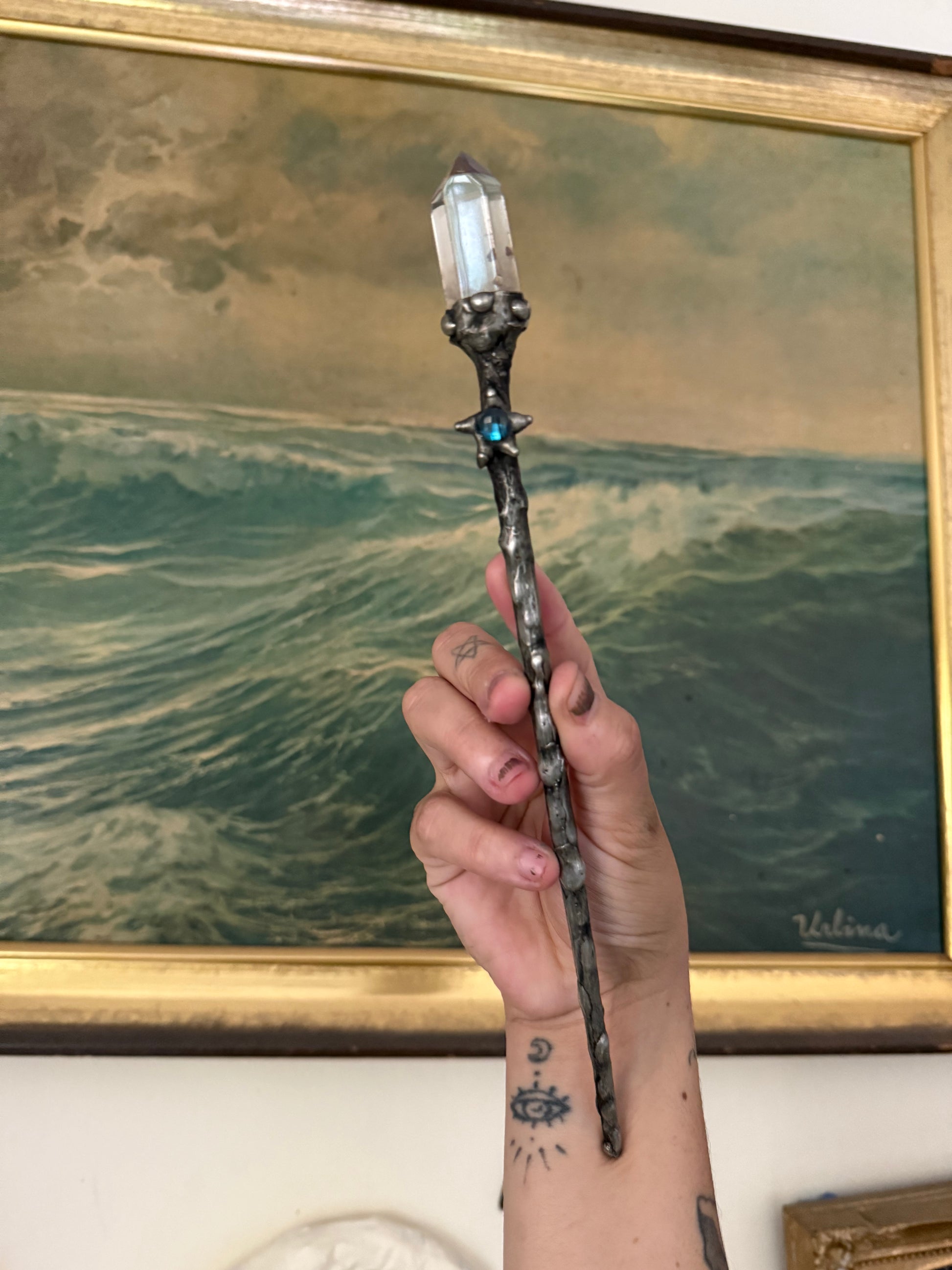 a beautiful flashy blue rose cut labradorite is tucked into a metal star. It is paired with a clear quartz at the crown. Fabricated out of a silver bearing alloy and darkened with patina for an aged look.
